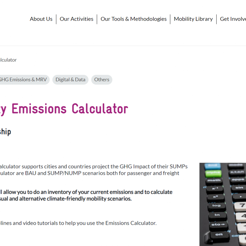 Emissions Calculator for calculating GHG emissions in transport as well as developing and evaluating climate scenarios of passenger and freight transport for road and rail. Developed in accordance with IPCC guidelines for BAU emissions, projected sustainable urban mobility plans (SUMPs) and national urban mobility policies (NUMPS) and investment programmes.